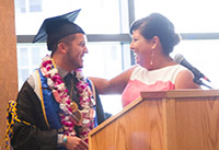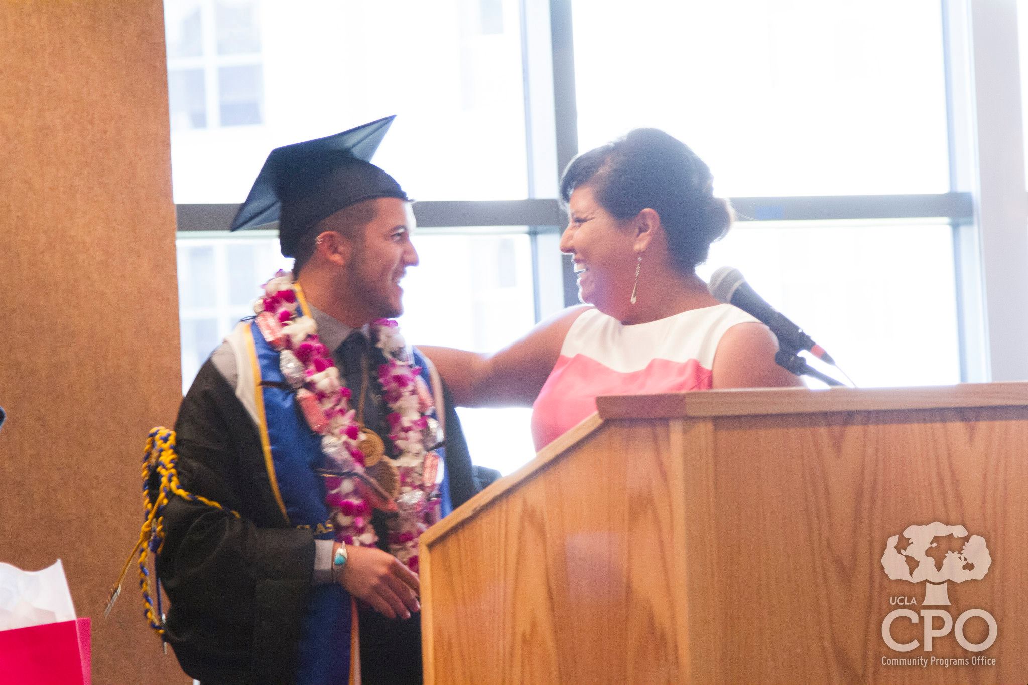 Dr. Rebecca Hernandez Rosser, Assistant Director of the American Indian Studies Center (Mescalero Apache/Mexican American) and Kenneth Ramos, graduating undergraduate and outgoing president of the American Indian Student Association (Kumeyaay from the Barona Band of Mission Indians), at the UCLA American Indian Graduation, when Rebecca was honored as “Woman of the Year.” June 14, 2013