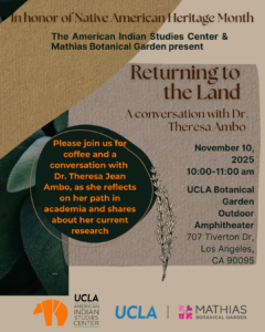 In honor of Native American Heritage Month, the American Indian Studies Center is hosting coffee and a conversation with Dr. Theresa Jean Ambo, as she reflects on her path in academia and shares about her current research. Coffee and light refreshments will be served.