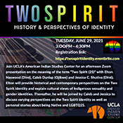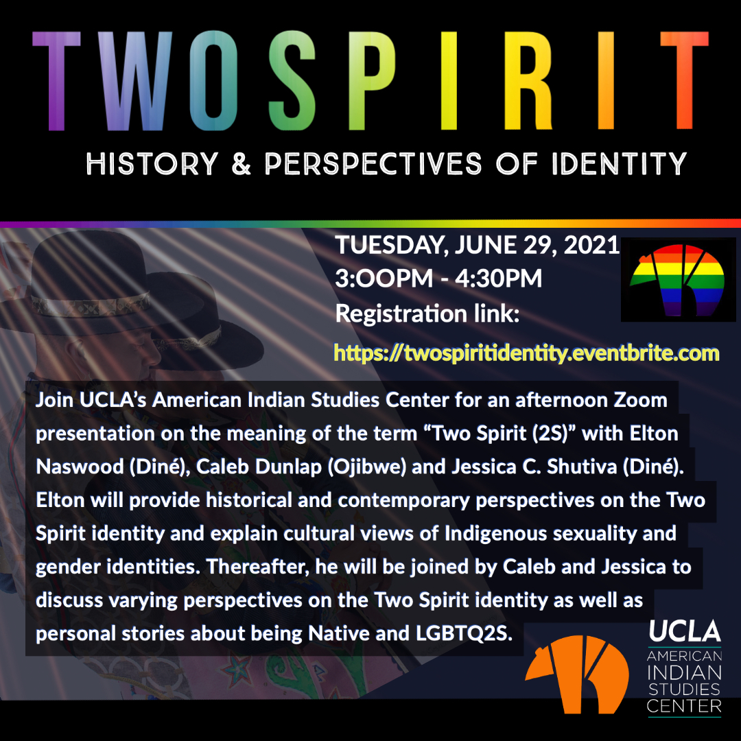 Join UCLA’s American Indian Studies Center for an afternoon Zoom presentation on the meaning of the term “Two Spirit (2S)” with Elton Naswood (Diné), Caleb Dunlap (Ojibwe) and Jessica C. Shutiva (Diné). Elton will provide historical and contemporary perspectives on the Two Spirit identity and explain cultural views of Indigenous sexuality and gender identities. Thereafter, he will be joined by Caleb and Jessica to discuss varying perspectives on the Two Spirit identity as well as personal stories about being Native and LGBTQ2S.